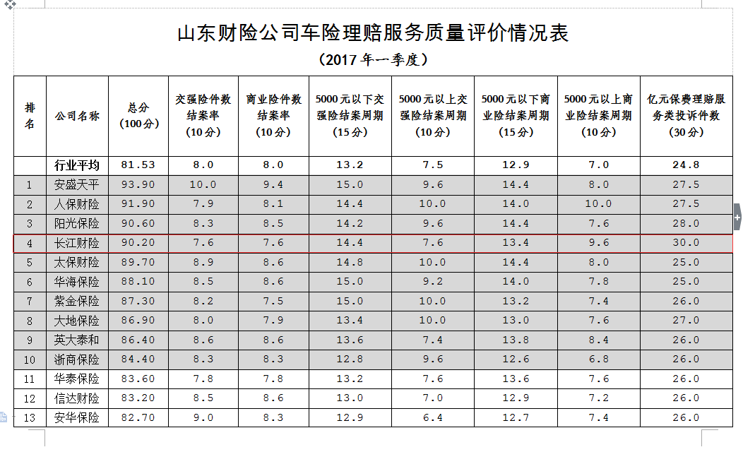新闻发布会主要是公布了车险理赔服务质量体系建设情况及车险理赔服务质量排行榜。该评价体系有关数据来源于中国保信全国车险信息平台,以家庭自用车为统计标的,数据周期为一年,区分交强险和商业险,包括理赔服务、消费投诉2大项内容,由结案率、结案周期等8小项评价指标组成。目前,山东地区共有36家保险公司(其中,33家保险公司经营期限超过一年)经营车险业务,长江财产保险山东分公司理赔服务各项评价指标均名列前茅,排名第四。